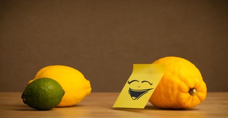 Lemon with sticky post-it note gesturing to citrus fruits