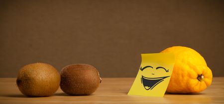 Lemon with sticky post-it note gesturing to kiwis