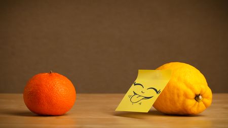 Lemon with sticky post-it note gesturing with tongue to orange