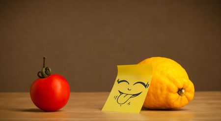 Lemon with sticky post-it note gesturing with tongue to tomato