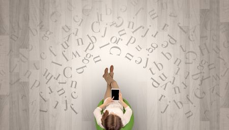 Letters with writer using tablet in a beige chair and an office space