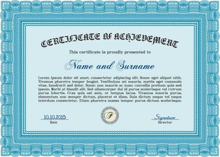 Light blue Awesome Certificate template. With great quality guilloche pattern. Money Pattern. Award.