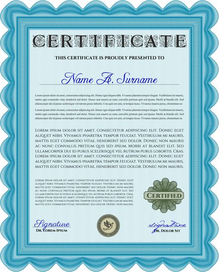 Light blue Awesome Certificate template. Money Pattern. Award. With great quality guilloche pattern.