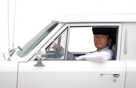 limousine driver inside the car over a blue sky