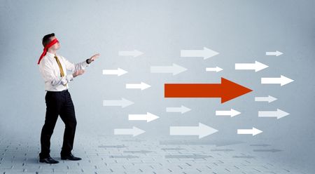 A lost young sales person with blindfolds trying to find the right path concept with large blue arrow sign pointing forward.