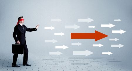A lost young sales person with blindfolds trying to find the right path concept with large blue arrow sign pointing forward.