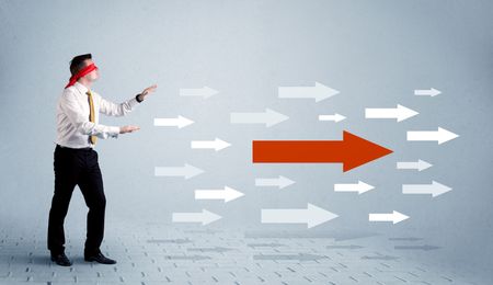 A lost young sales person with blindfolds trying to find the right path concept with large blue arrow sign pointing forward.