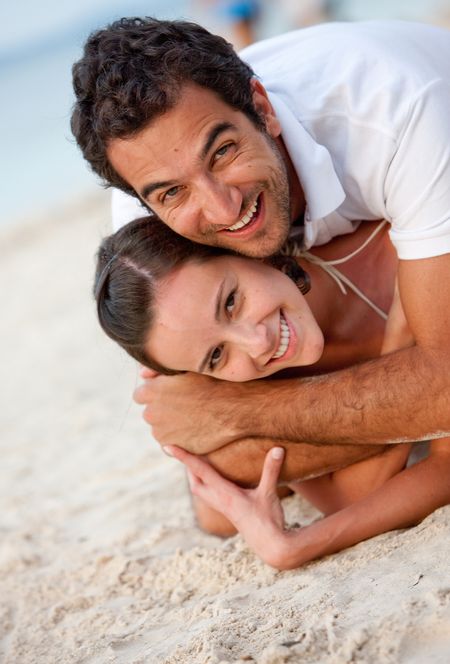 Loving couple lying at the beach on sand