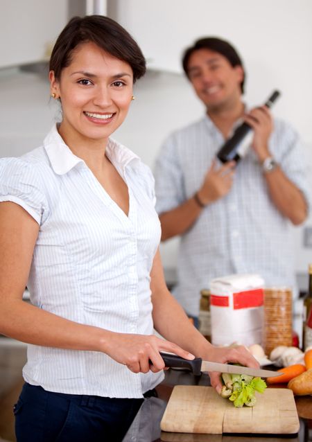 Loving couple making dinner at home and smiling