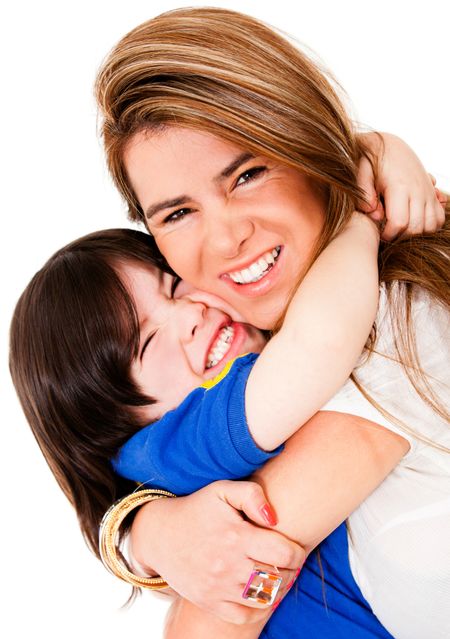 Loving mother and son smiling - isolated over a white background