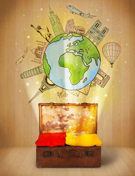 Luggage with travel around the world illustration concept on grungy background