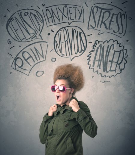 Mad young woman with extreme haisrtyle and speech bubbles concept on background