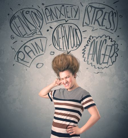 Mad young woman with extreme haisrtyle and speech bubbles concept on background