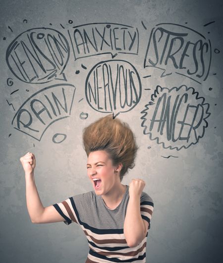 Mad young woman with extreme haisrtyle and speech bubbles concept on background