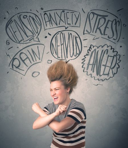 Mad young woman with extreme haisrtyle and speech bubbles concept on background