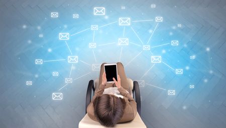 Mail symbols with woman using device in a beige chair