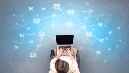 Mail symbols with woman using device in a beige chair
