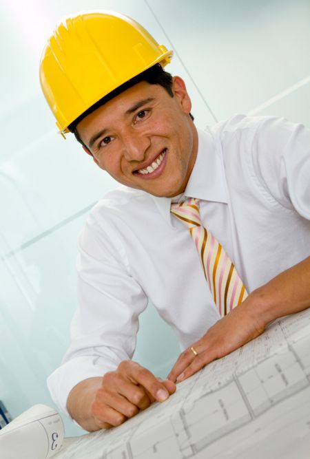 Male architect at the office wearing a helmet
