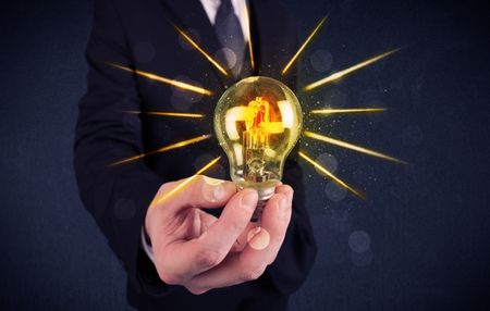 A male business person holding an electric light bulb in his hand with beam rays illustration concept.