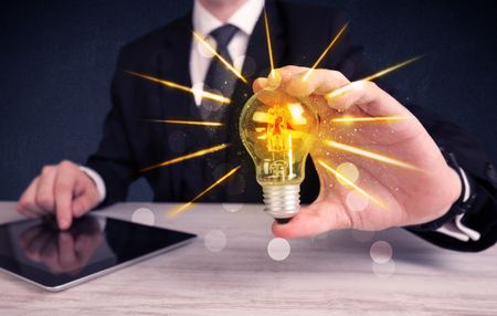 A male business person holding an electric light bulb in his hand with beam rays illustration concept.