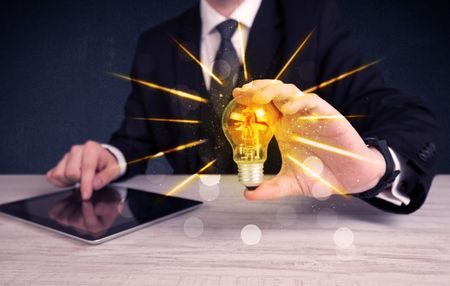 A male business person holding an electric light bulb in his hand with beam rays illustration concept.