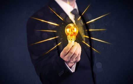 A male business person holding an electric light bulb in his hand with beam rays illustration concept.