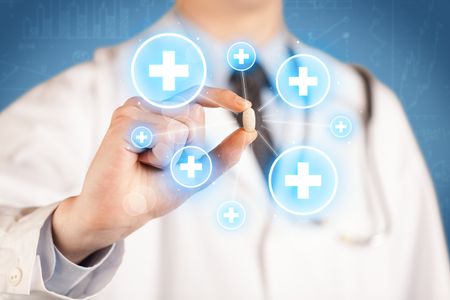 A male doctor in coat in front of a blue wall holding a pill between his fingers with lines and white crosses in circles