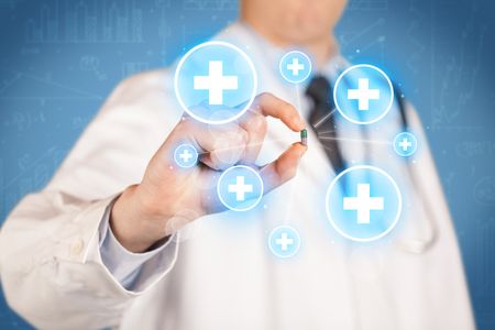 A male doctor in coat in front of a blue wall holding a pill between his fingers with lines and white crosses in circles