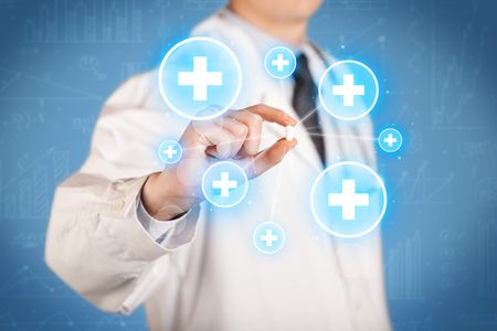 A male doctor in coat in front of a blue wall holding a pill between his fingers with lines and white crosses in circles