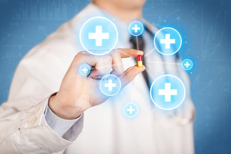 A male doctor in coat in front of a blue wall holding a pill between his fingers with lines and white crosses in circles