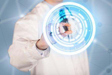 A male doctor in white coat showing a glowing pill in blue, white circles