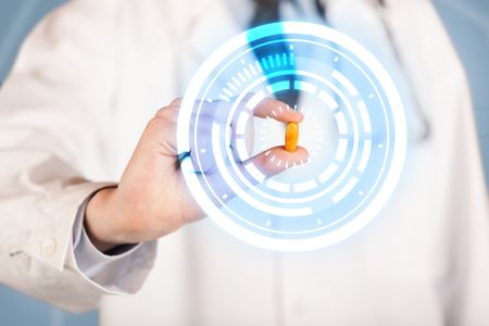 A male doctor in white coat showing a glowing pill in blue, white circles