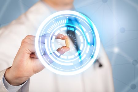 A male doctor in white coat showing a glowing pill in blue, white circles