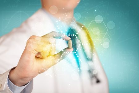 A male doctor in white coat with a stethoscope holding a pill with glowing colorful dots and lines