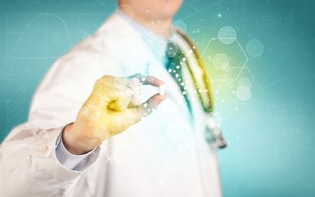 A male doctor in white coat with a stethoscope holding a pill with glowing colorful dots and lines
