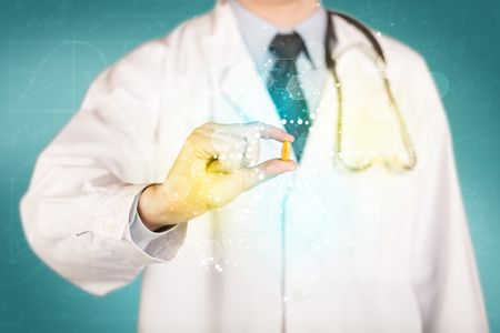 A male doctor in white coat with a stethoscope holding a pill with glowing colorful dots and lines