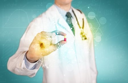 A male doctor in white coat with a stethoscope holding a pill with glowing colorful dots and lines