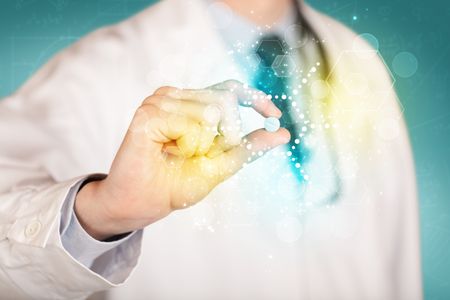 A male doctor in white coat with a stethoscope holding a pill with glowing colorful dots and lines