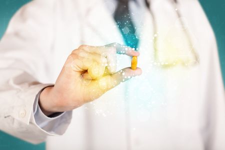 A male doctor in white coat with a stethoscope holding a pill with glowing colorful dots and lines