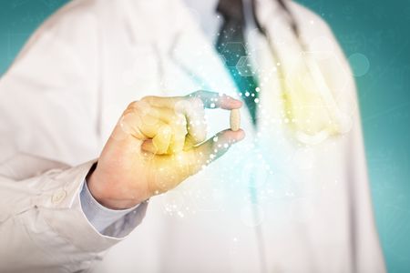 A male doctor in white coat with a stethoscope holding a pill with glowing colorful dots and lines