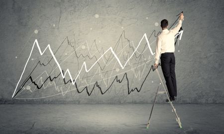 A male in elegant suit standing on a small ladder and drawing progressing lines on grey wall background