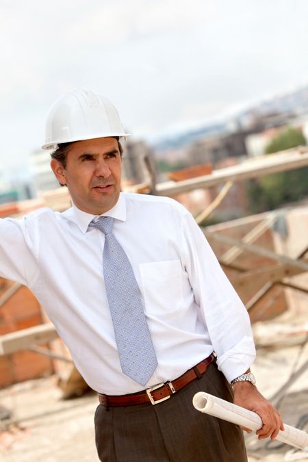 male engineer at a construction site holding blueprints