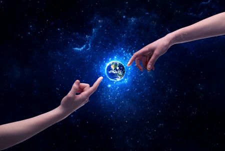 Male god hands about to touch the earth globe in the galaxy with bright shining stars and blue light illustration concept. Elements of this image furnished by NASA.