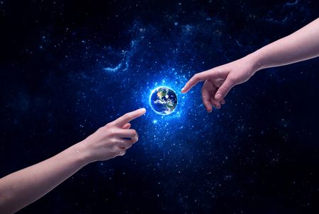 Male god hands about to touch the earth globe in the galaxy with bright shining stars and blue light illustration concept. Elements of this image furnished by NASA.