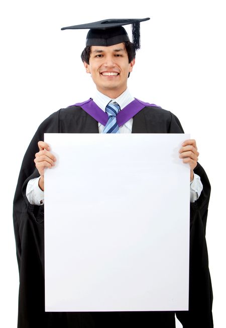 Male graduate displaying a banner ad isolated over a white background