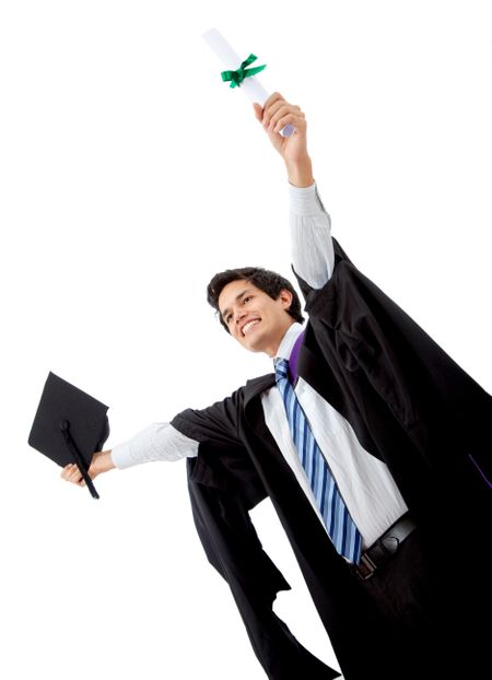 male graduate full of success with his arms up isolated over a white background