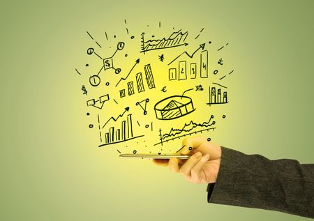 A male hand holding a mobile phone from profile view with graphs, business pie sharts and statistics above the device illustration concept