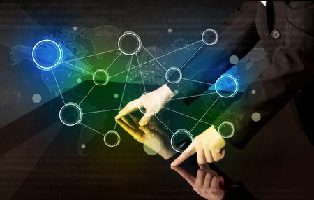 Male hands touching interactive table with colorful world map on it