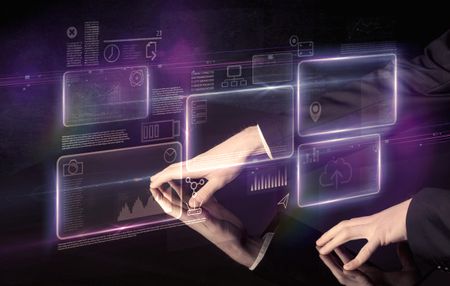 Male hands touching interactive table with purple cloudspace graphic on it