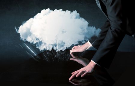Male hands touching interactive table with a white cloud on it